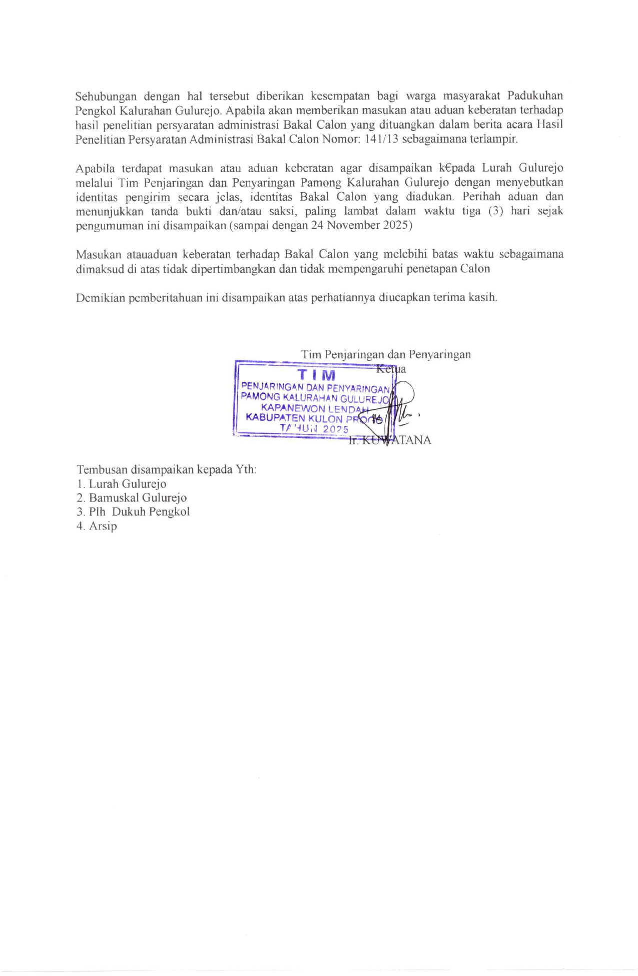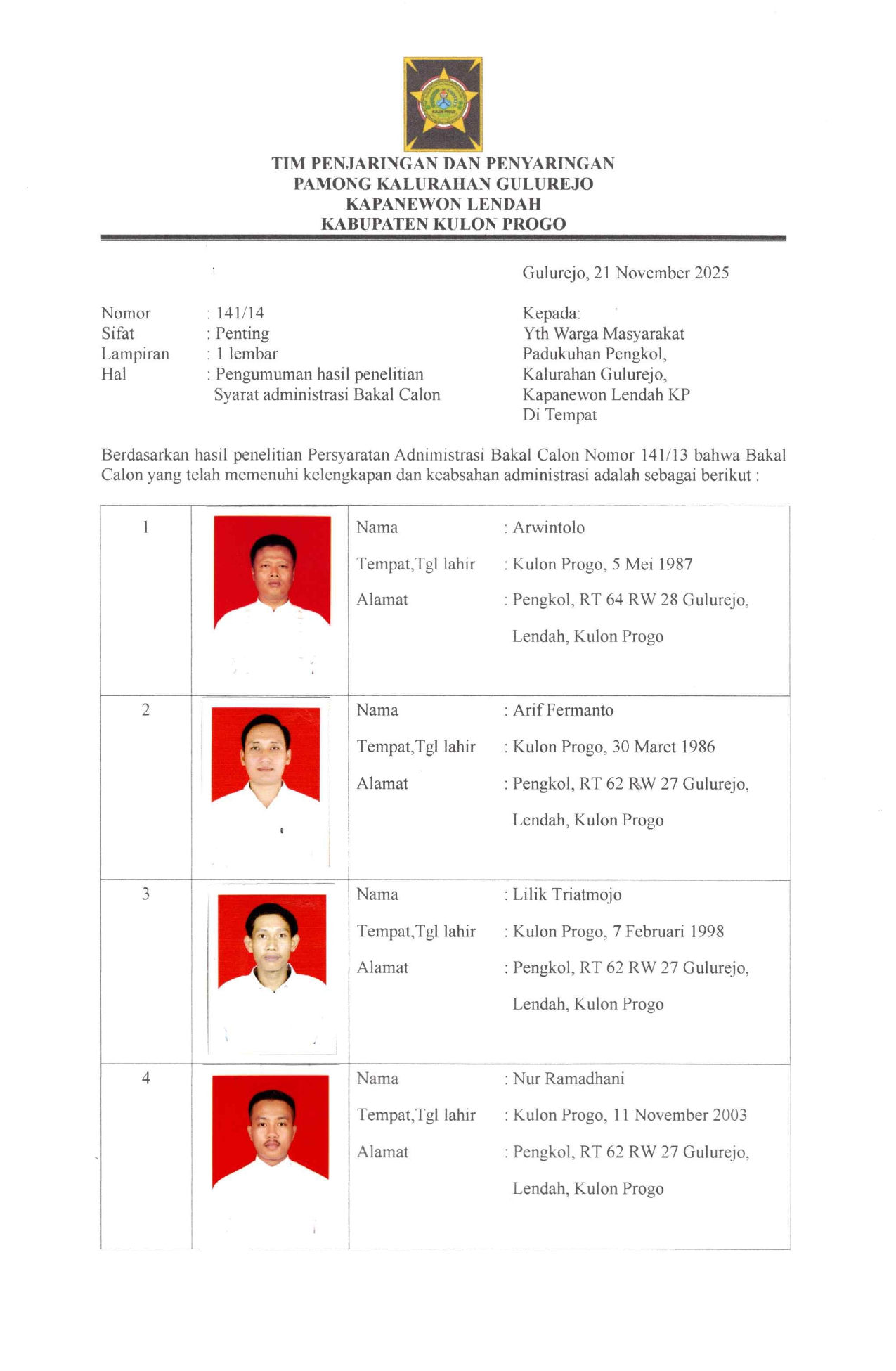 Gulurejo ( 21-11-2025 ) Panitia Pengisian Lowongan Pamong ( Dukuh Pengkol ) Kalurahan Gulurejo telah membuka pendaftaran dan melakukan penjaringan mulai tanggal 14 Oktober s/d 31 Oktober 2025, dan dari hasil penjaringan tersebut terdapat 4 bakal calon dukuh.