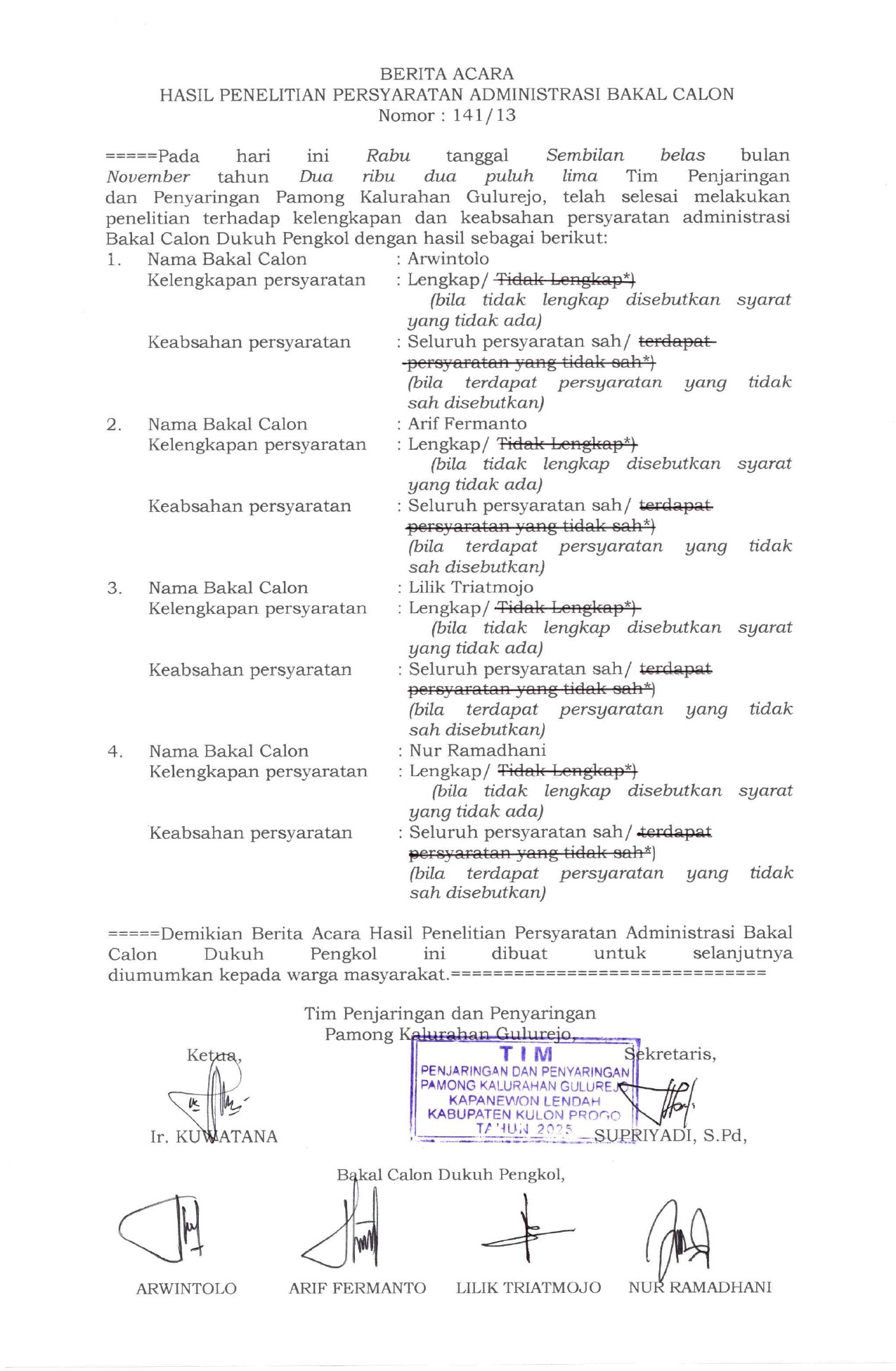 Berdasarkan seleksi administratif, Tim Panitia Pengisian Pamong telah melakukan penelitian berkas persyaratan bakal calon Dukuh Pengkol sejumlah 4 (empat) orang bakal calon. Setelah dilakukan penelitian berkas administrasi dan klarifikasi, keempat Bakal Calon dinyatakan lolos seleksi administrasi, sehingga berhak mengikuti tahapan selanjutnya yaitu pengumuman kepada masyarakat terutama warga masyarakat Padukuhan Pengkol.