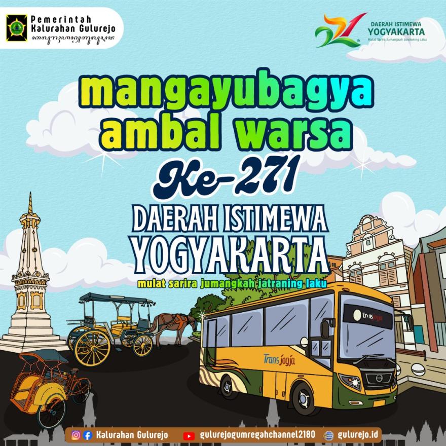 Gulurejo, 13 Maret 2026. Hari Jadi ke-271 Daerah Istimewa Yogyakarta (DIY) diperingati pada 13 Maret 2026 dengan mengusung tema "Mulat Sarira Jumangkah Jantraning Laku". Peringatan ini ditandai dengan berbagai kegiatan, termasuk Malam Tirakatan di Bangsal Kepatihan, upacara resmi, kirab budaya, dan peluncuran logo baru. Momentum ini menjadi ajang refleksi, kebersamaan, dan penguatan nilai keistimewaan.